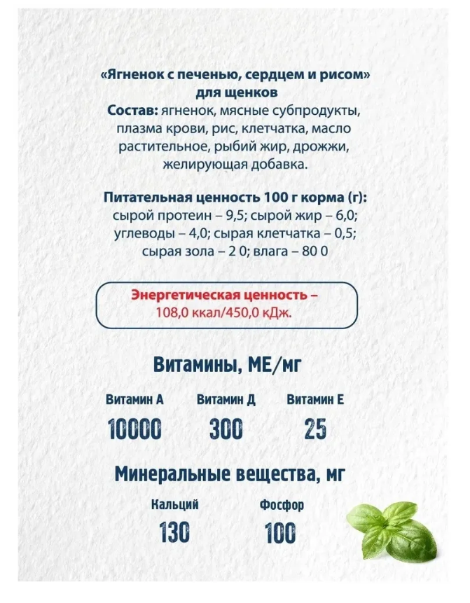 | Состав | ягненок, мясные субпродукты, плазма крови, рис, клетчатка, масло растительное, рыбий жир, дрожжи, желирующая добавка, вода, витаминно-минеральный комплекс |