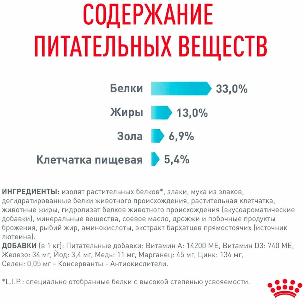 | Состав | изолят растительных белков*, дегидратированные белки животного происхождения (птица), мука из зерновых культур, рис, пшеница, растительная клетчатка, животные жиры, гидролизат белков животного происхождения (вкусоароматические добавки), минеральные вещества, дрожжи, соевое масло, рыбий жир, экстракт бархатцев прямостоячих (источник лютеина). |
