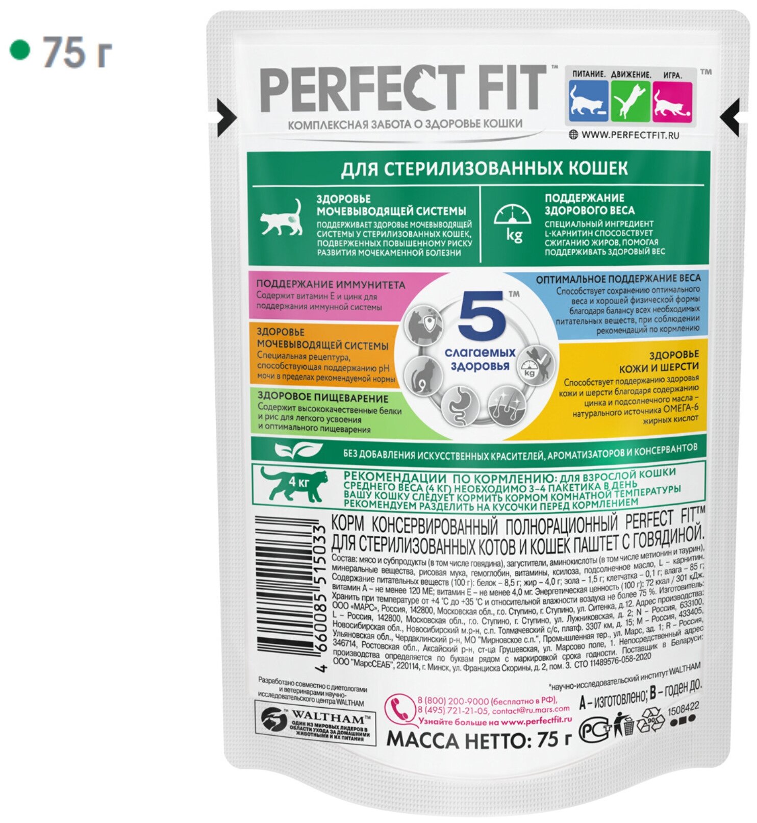 Перфект Фит 10237367/10245093 пауч д/стерилизованных кошек паштет Говядина 75г