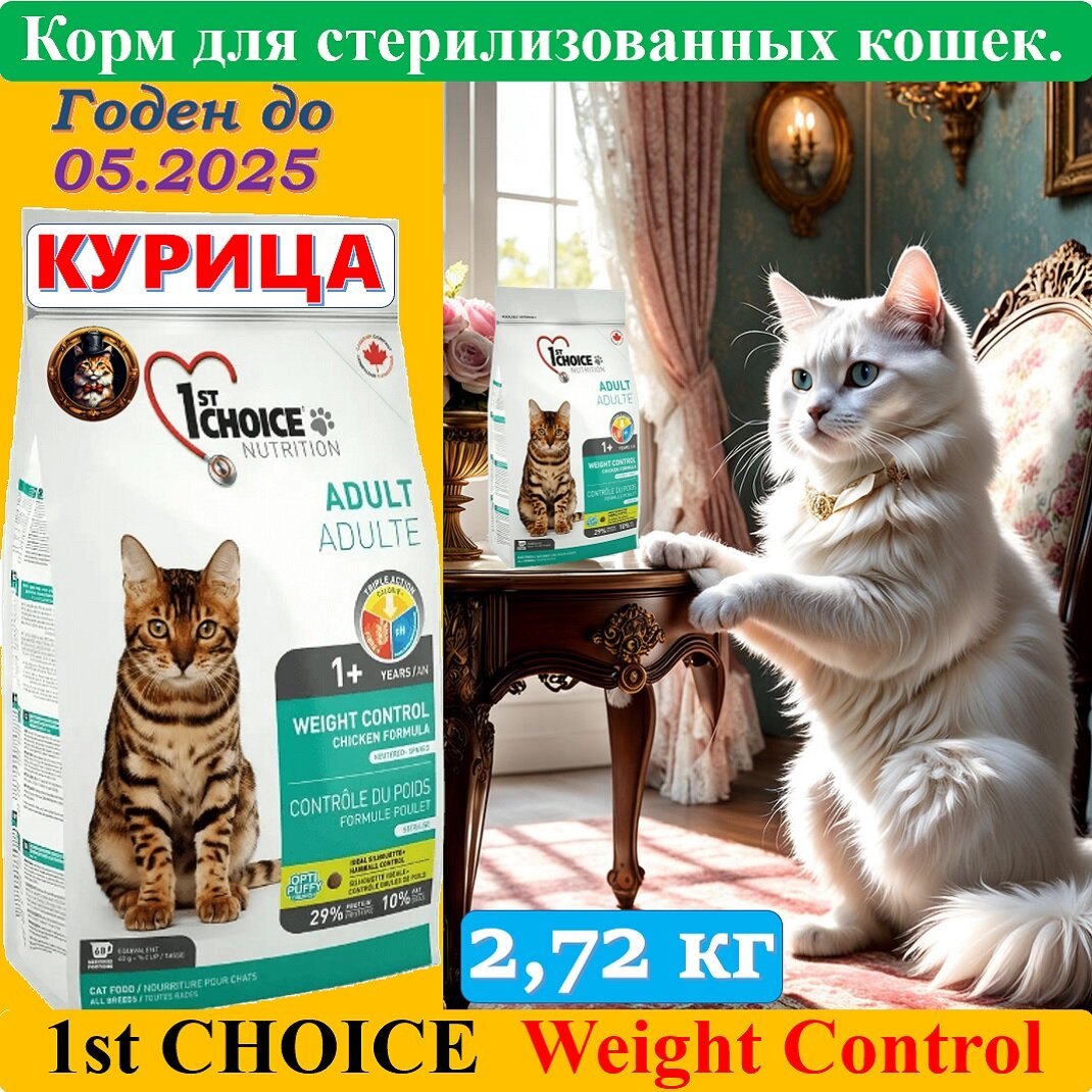 Сухой корм для кошек 1st CHOICE Weight Control с курицей, контроль веса 2,72 кг