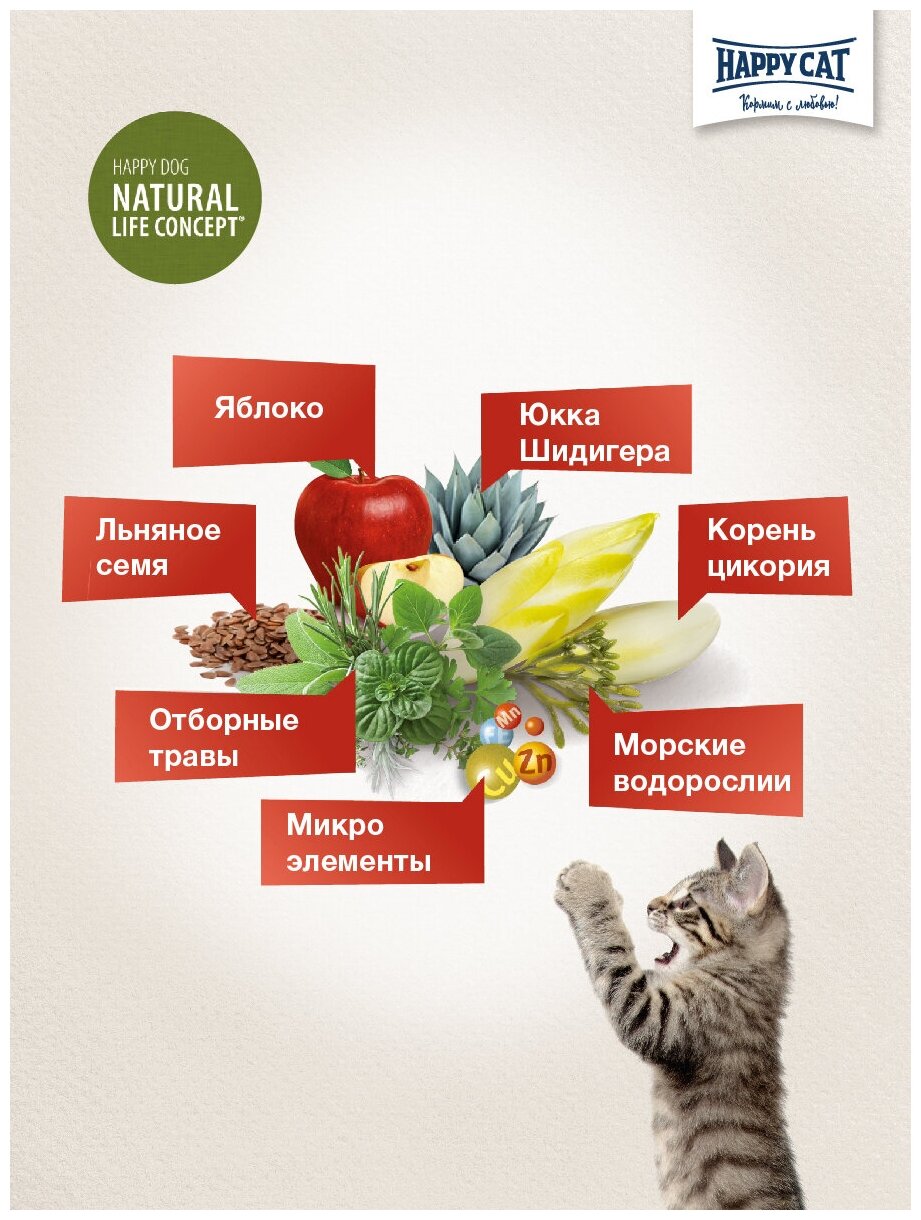 | Дополнительная информация | корм Happy Cat Weide-Lamm не содержит злаков, легко усваивается, а также подходит для кормления кошек с чувствительным пищеварением; полнорационный корм для взрослых кошек от 12 месяцев |