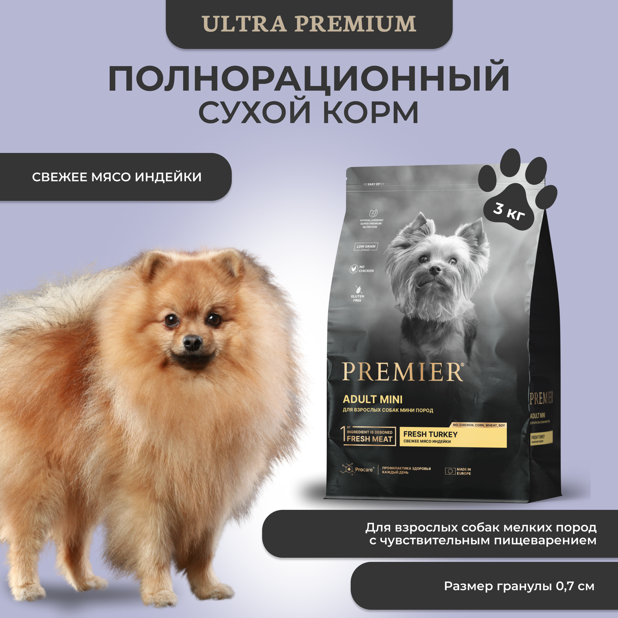 Сухой корм Premier с индейкой для собак мелких пород, 3 кг