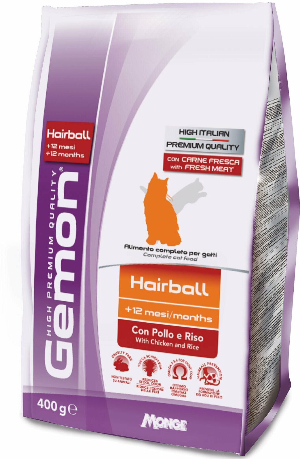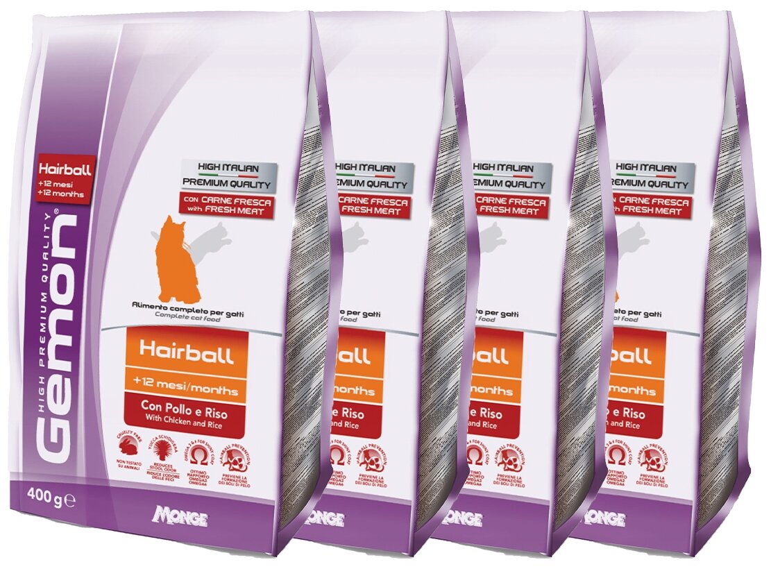 Сухой корм для кошек Gemon Cat Hairball con Pollo e Rico, для вывода шерсти, курица с рисом, 4 шт х 400 г
