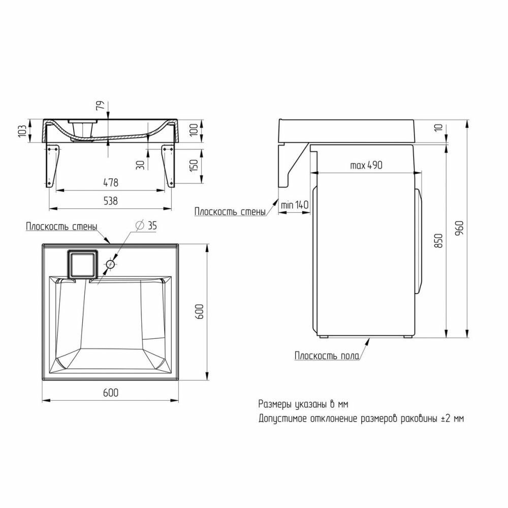 Умывальник "Siena " 60*60 ш*г над стиральной машиной без перелива, с кронштейнами (Paola)