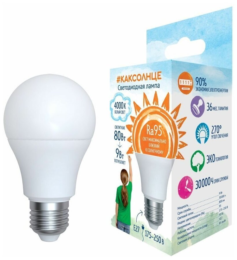 Типы/Лампочки/Светодиодные Uniel LED-A60-9W/4000K/E27/FR/RA95 PLK01WH Лампа светодиодная, матовая. Белый свет (4000K). Картон. ТМ Uniel.