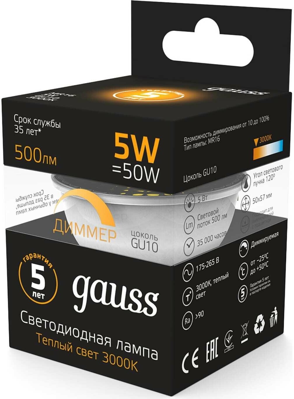 Gauss Лампа MR16 5W 500lm 3000K GU10 диммируемая LED 1/10/100