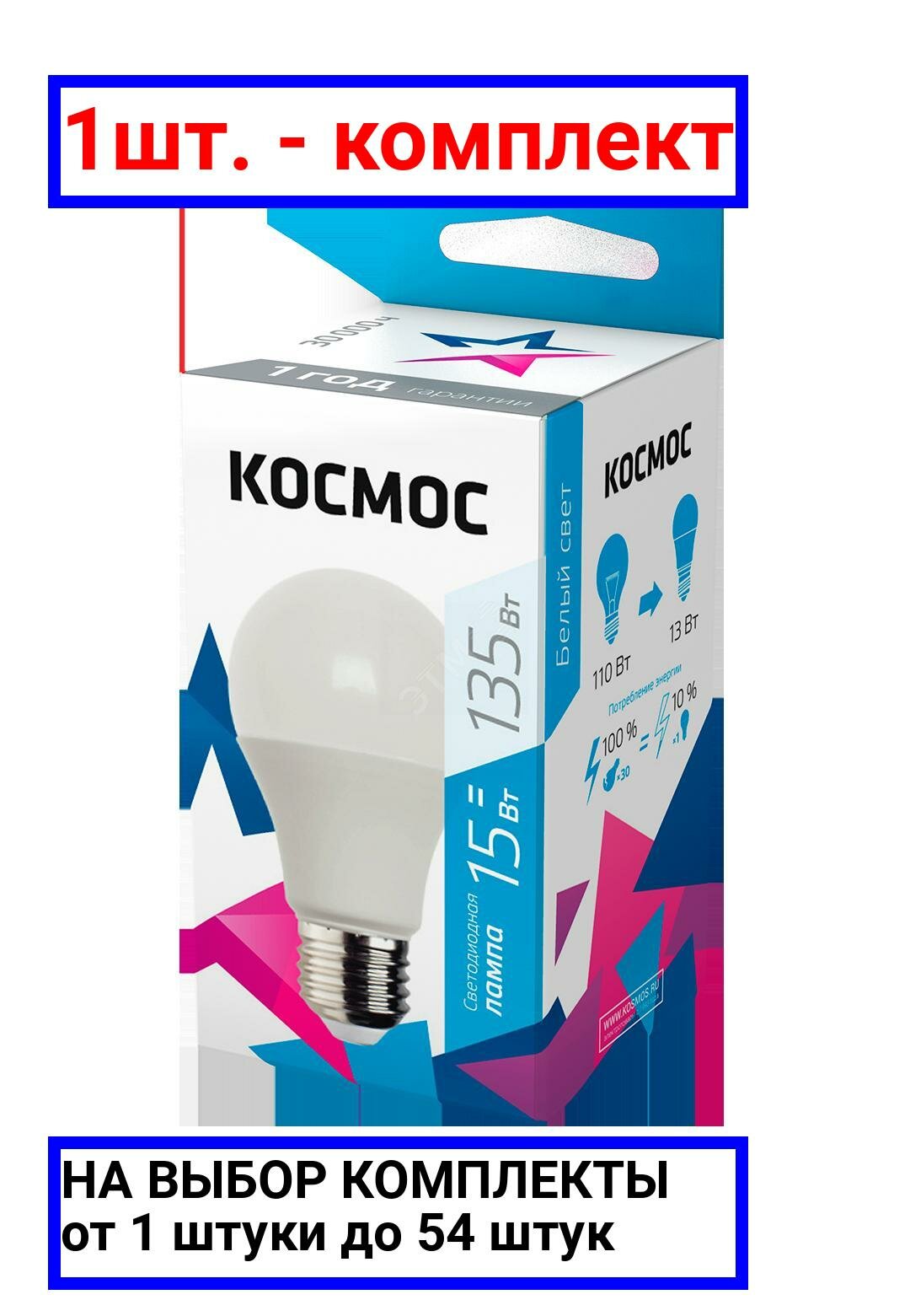 (10 шт.) Светодиодная лампочка Космос ЛОН A60 E27 15W (1300lm) 4500K 4K матов. 108x60 LkecLED15wA60E2745 . Цоколь E27