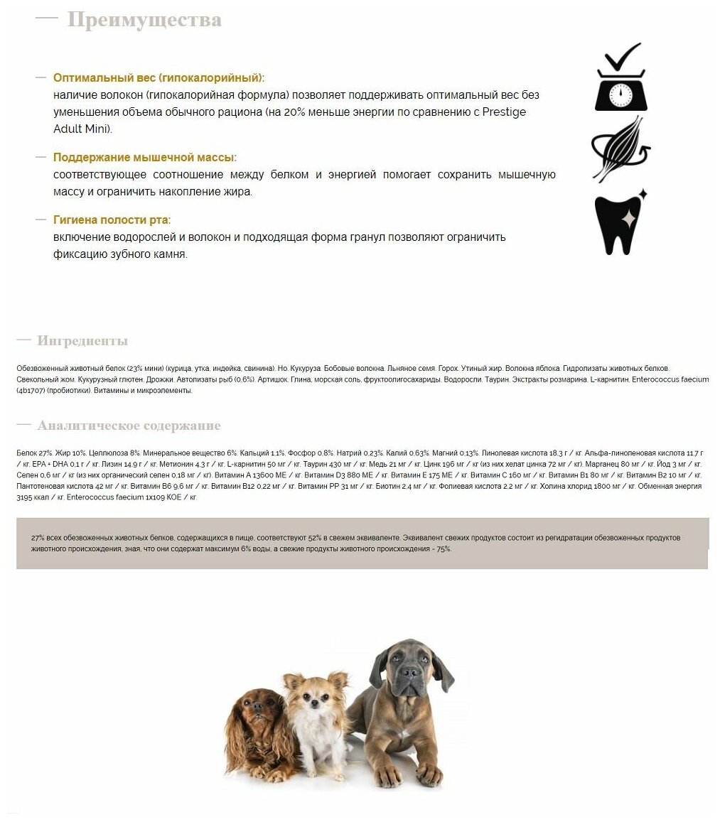 | Дополнительная информация | ОПТИМАЛЬНЫЙ ВЕС (низкая калорийность) Входящая в состав клетчатка (низкокалорийная формула) помогает поддерживать идеальный вес, не сокращая объем питания (калорийность на 20% меньше по сравнению с Prestige Adult Mini). ПОДДЕРЖАНИЕ МЫШЕЧНОЙ МАССЫ Правильное соотношение белков и общей калорийности помогает поддерживать мышечную массу и предупреждать отложение жиров. УХОД ЗА ЗУБАМИ (морские водоросли) Входящие в состав корма морские водоросли и клетчатка, а также особый размер гранул препятствуют образованию зубного камня. |