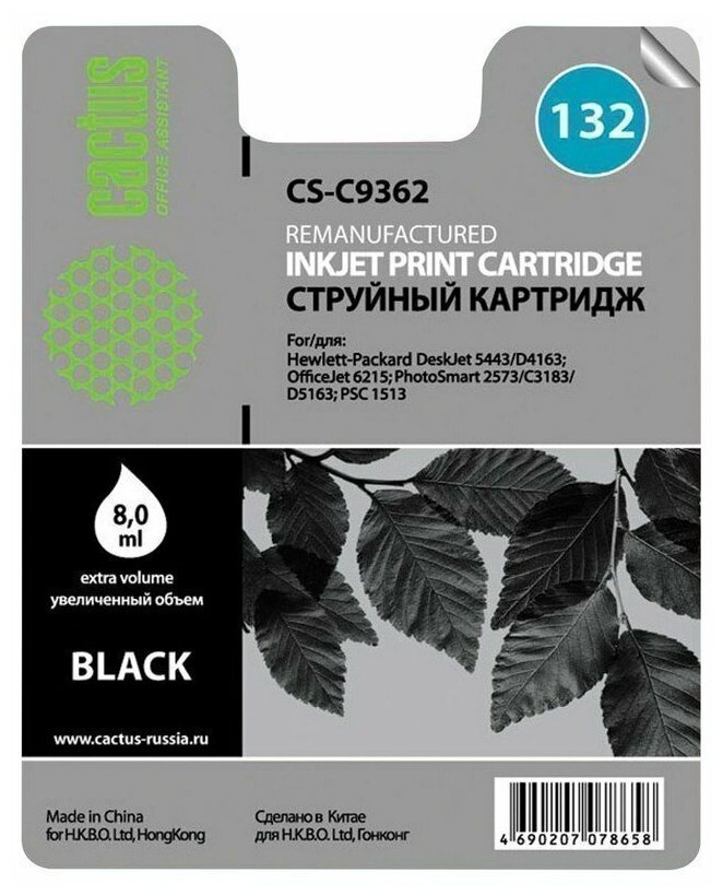 Картридж Cactus CS-C9362 №132 для HP DJ 5443/D4163/DJ 6215/PS 2573/C3183/D5163/PSC 1513, черный