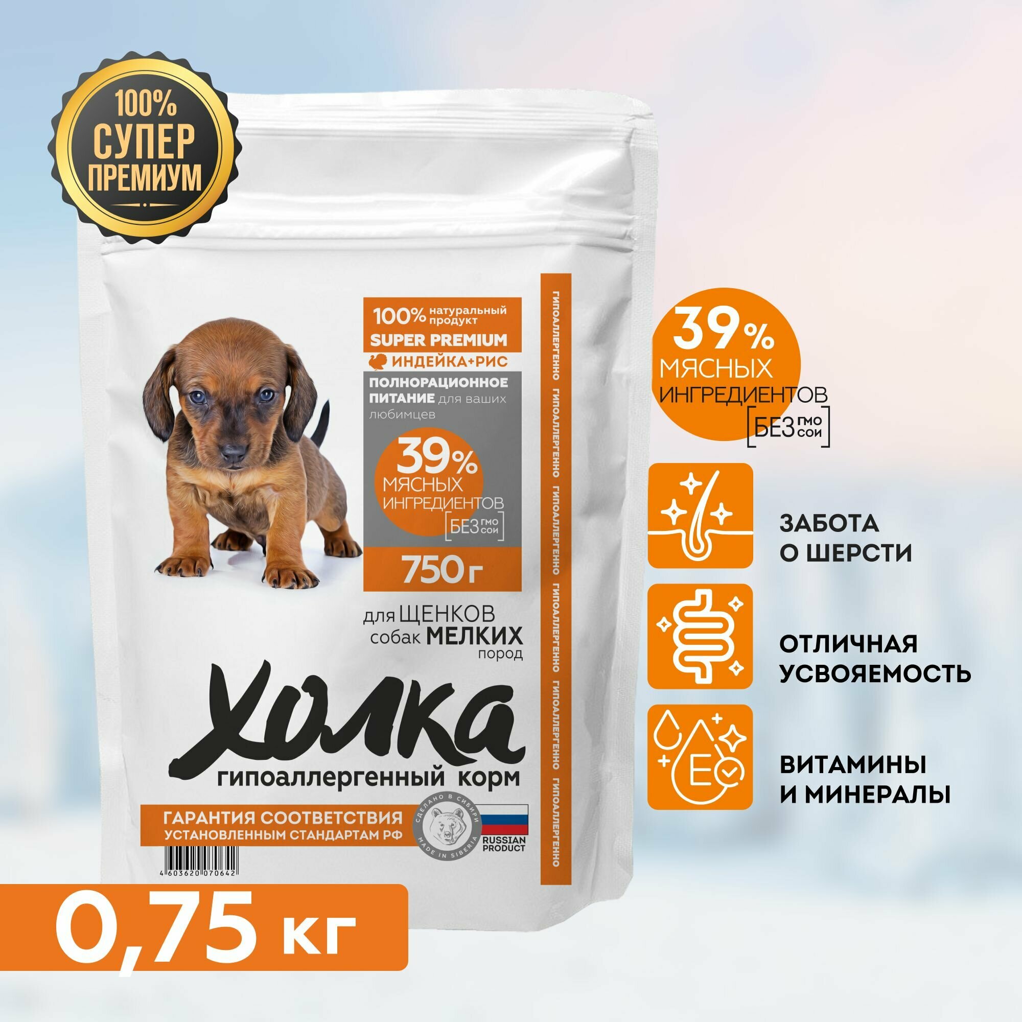 Полнорационный гипоаллергенный сухой корм "Холка" для щенков собак мелких пород 750гр.