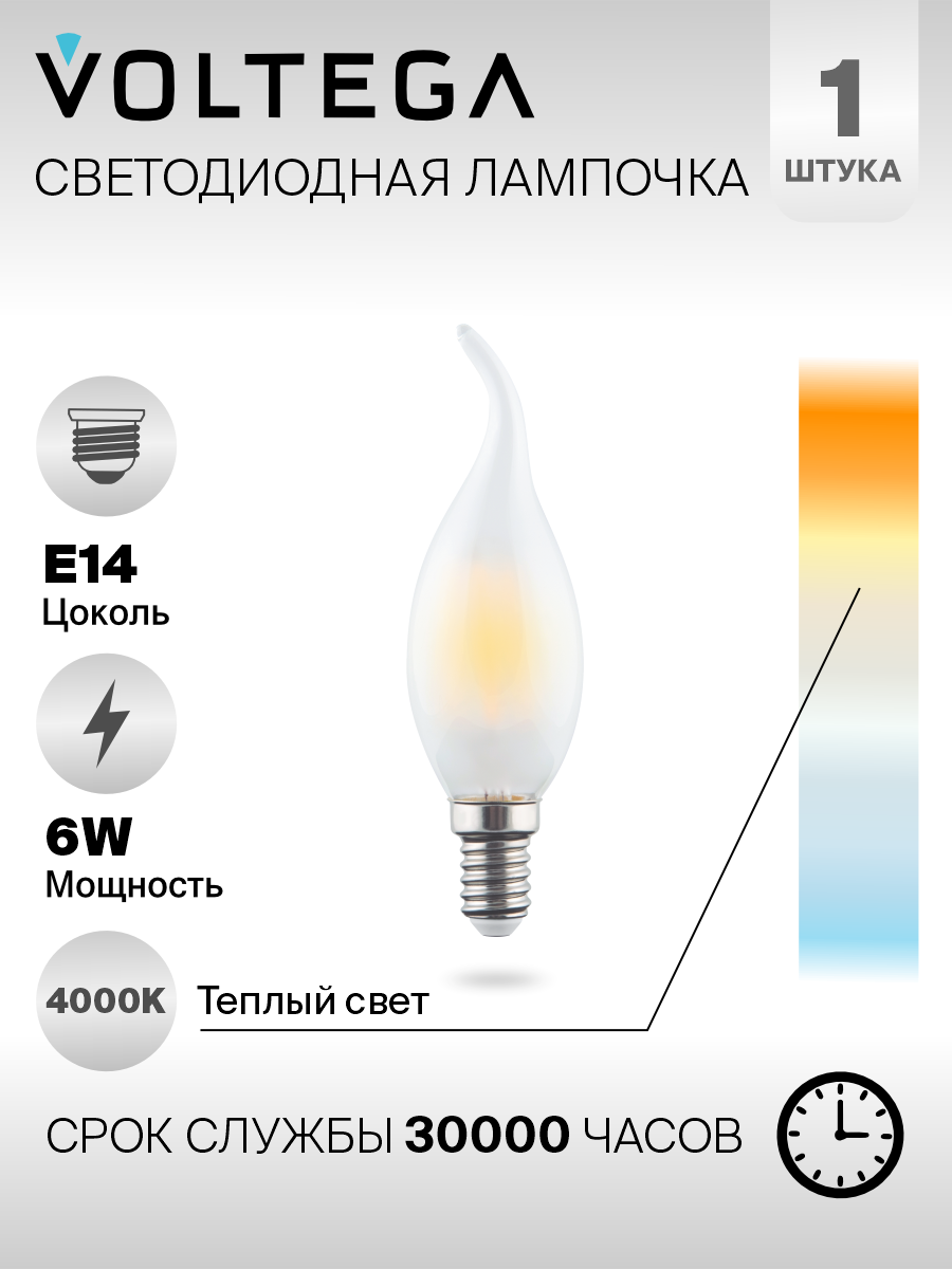 Лампочка светодиодная E14 форма свеча на ветру 6W нейтральный свет Voltega Crystal Candle wind matt 4000K упаковка 6 шт.