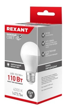 Светодиодная лампа REXANT Груша E27, 15.5 Вт, A60, 1473 Лм (=130 Вт), 4000 K (нейтральный свет), упаковка 3 шт.