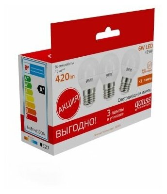 Лампа светодиодная LED 6вт 230в Е27 теплый матовая шар Gauss промо (3 лампы в упаковке) () GAUSS 53216T (1 упак)