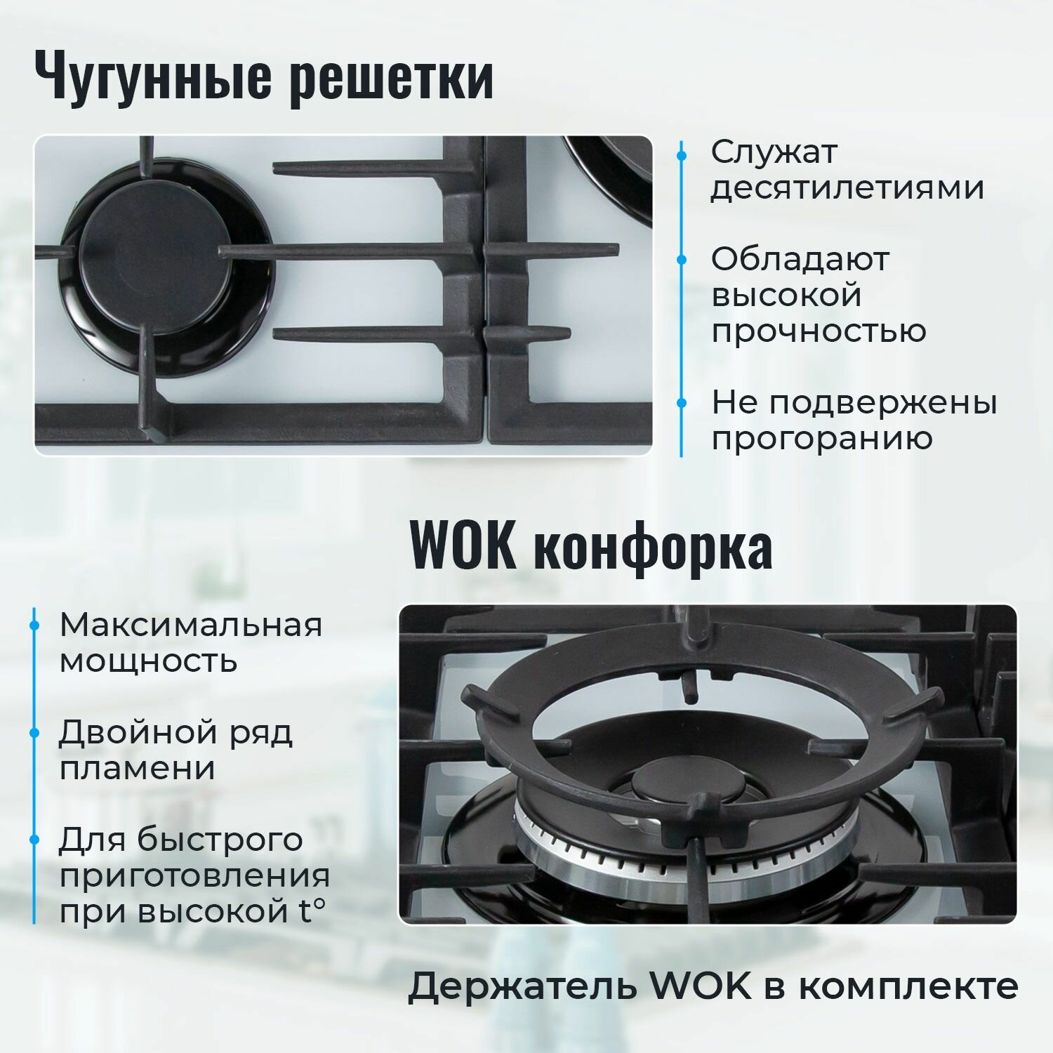 | Дополнительная информация | 5 газовых конфорок: 1 wok-горелка 4800 Вт 1 конфорка повышенной мощности 2600 Вт 2 стандартные конфорки 1600 Вт |