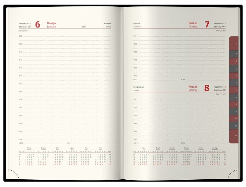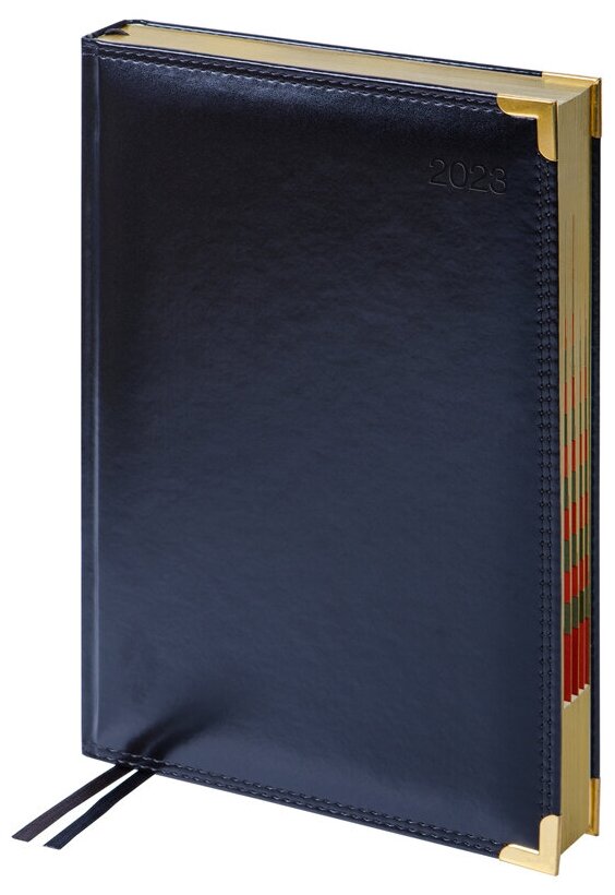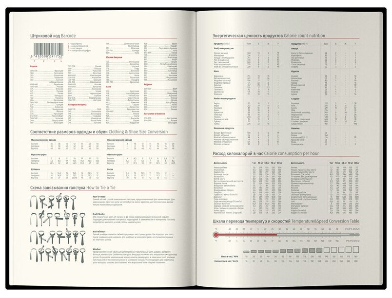 | Особенности | календарь / ляссе / металлические уголки на обложке / перфорация уголков / прошивка по периметру обложки / справочная информация / цветной обрез |