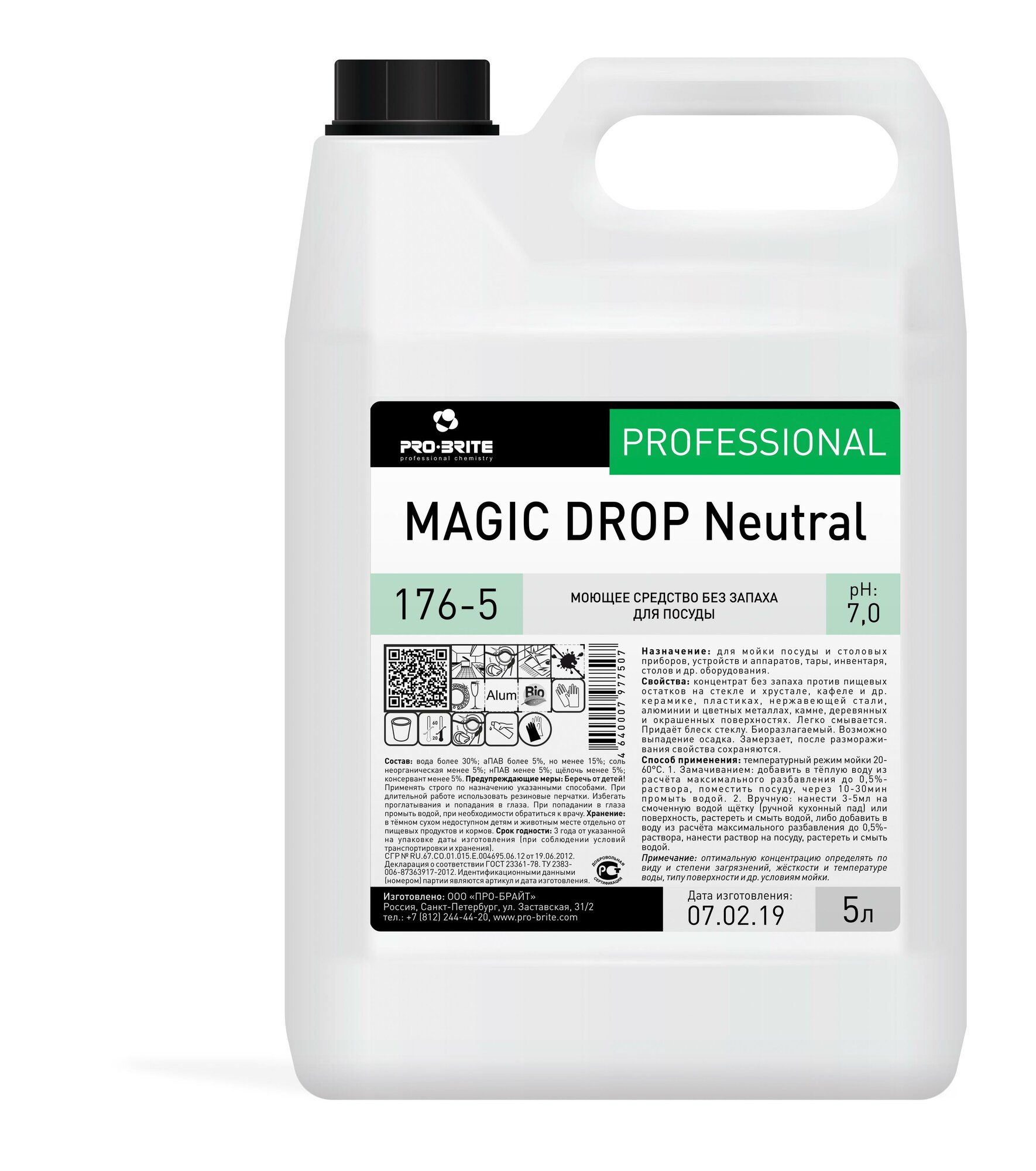 Средство для мытья посуды 5л PRO-BRITE MAGIC DROP Neutral, без запаха, нейтральное, концентрат, 176-5