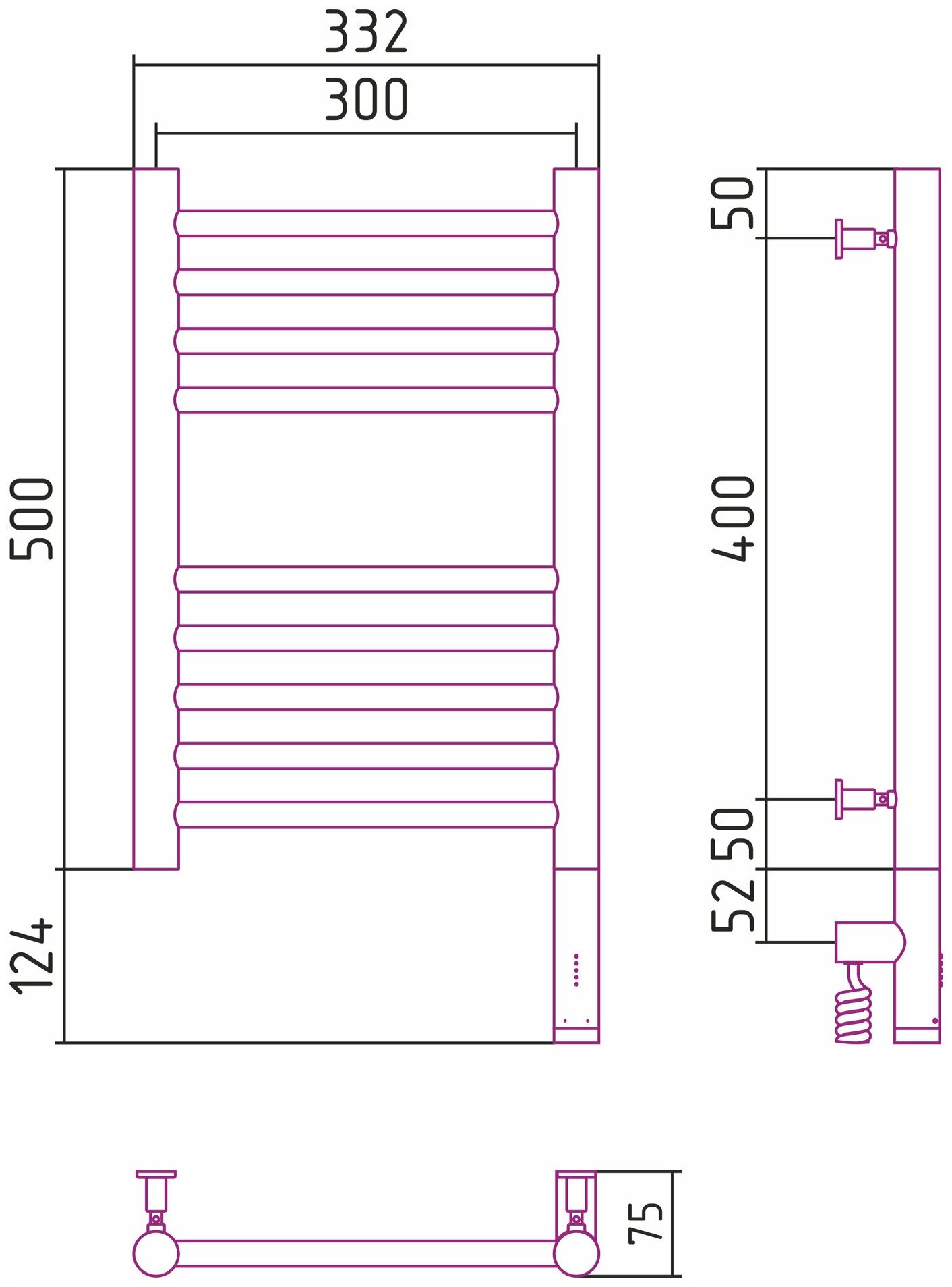 Полотенцесушитель электрический Сунержа 31-5805-5030 Богема 3.0 Полотенцесушитель электрический РЭБ, прямая, 500х300 мм/ МЭМ правый, матовый черный