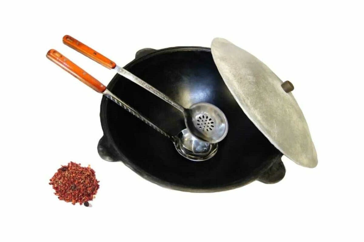 Казан Узбекский чугунный 22 литра (круглое дно) с алюминиевой крышкой, с шумовкой, половником и специями интересное: