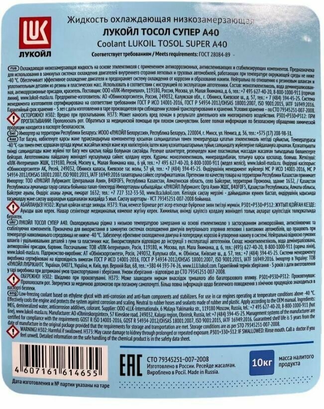 Антифриз ЛУКОЙЛ тосол супер А40 10 кг
