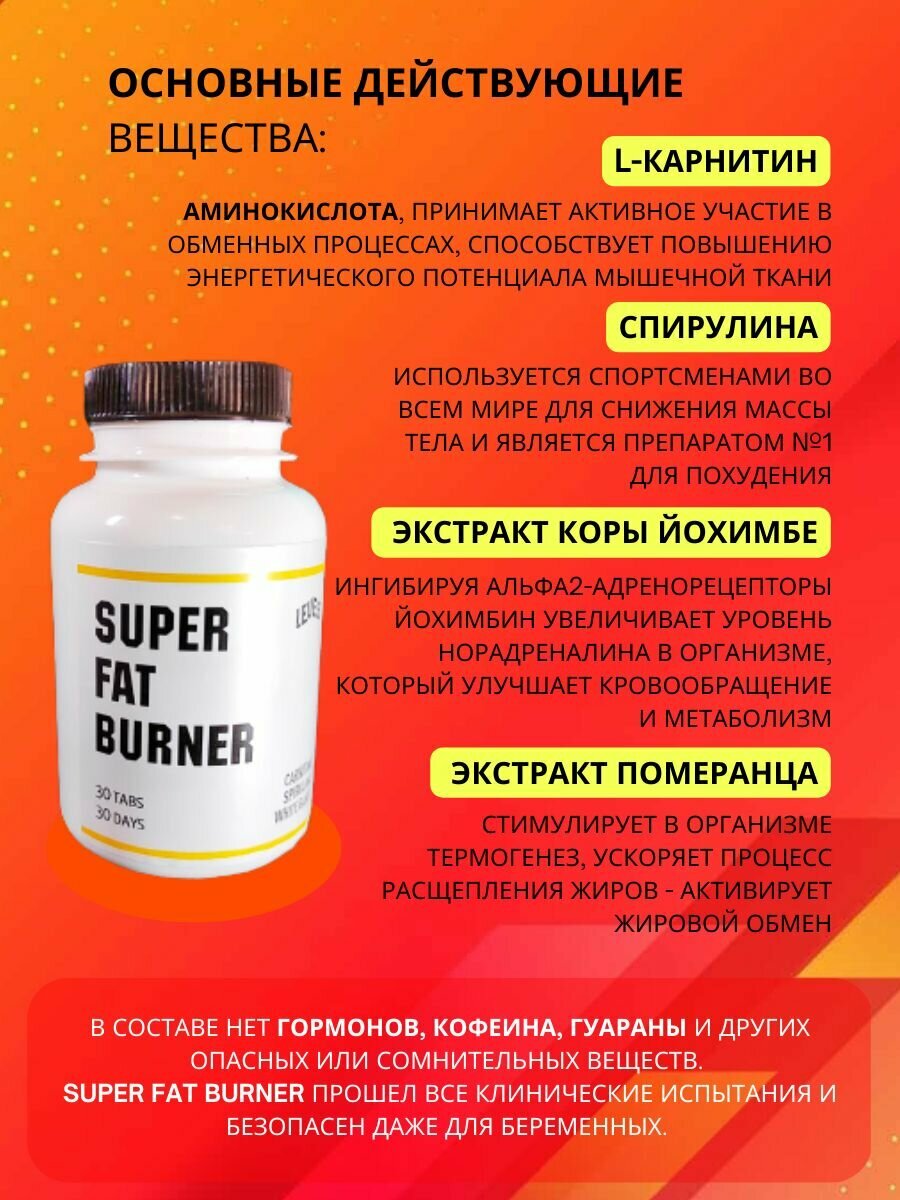 | Дополнительная информация | Премиальный препарат LEVELS SUPER FAT BURNER - средство для быстрого похудения для женщин и мужчин. SUPER FAT BURNER с легкостью разрушает жировые отложения даже в самых трудных местах. |
