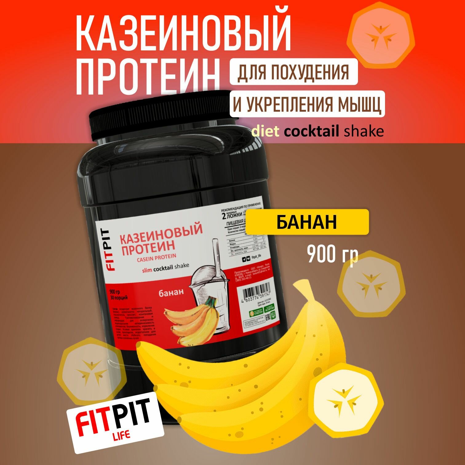 Купить FITPIT Казеиновый протеин (Казеин) (Концентрат молочного белка) 900 гр Банан Для похудения и укрепления мышц