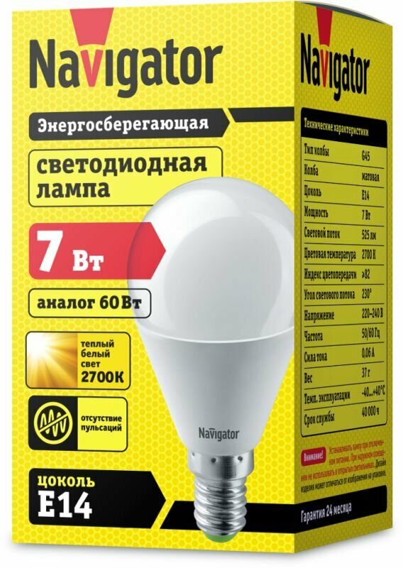 Ниже Вы можете прочитать отзывы на Лампа светодиодная 94 466 NLL-G45-7-230-2.7K-E14 7Вт шар 2700К тепл. бел. E14 500лм 176-264В Navigator 94466, ознакомится с подробными характеристиками, посмотреть интересные обзоры и фотографии на Лампа светодиодная 94 466 NLL-G45-7-230-2.7K-E14 7Вт шар 2700К тепл. бел. E14 500лм 176-264В Navigator 94466.