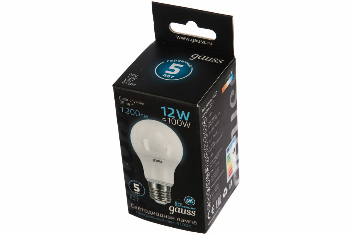 Лампа светодиодная Gauss A60 12Вт цоколь: E27 шар 220B 4100K цвет свечения белый нейтральный A60 (упаковка: 10 штук) (102502212)