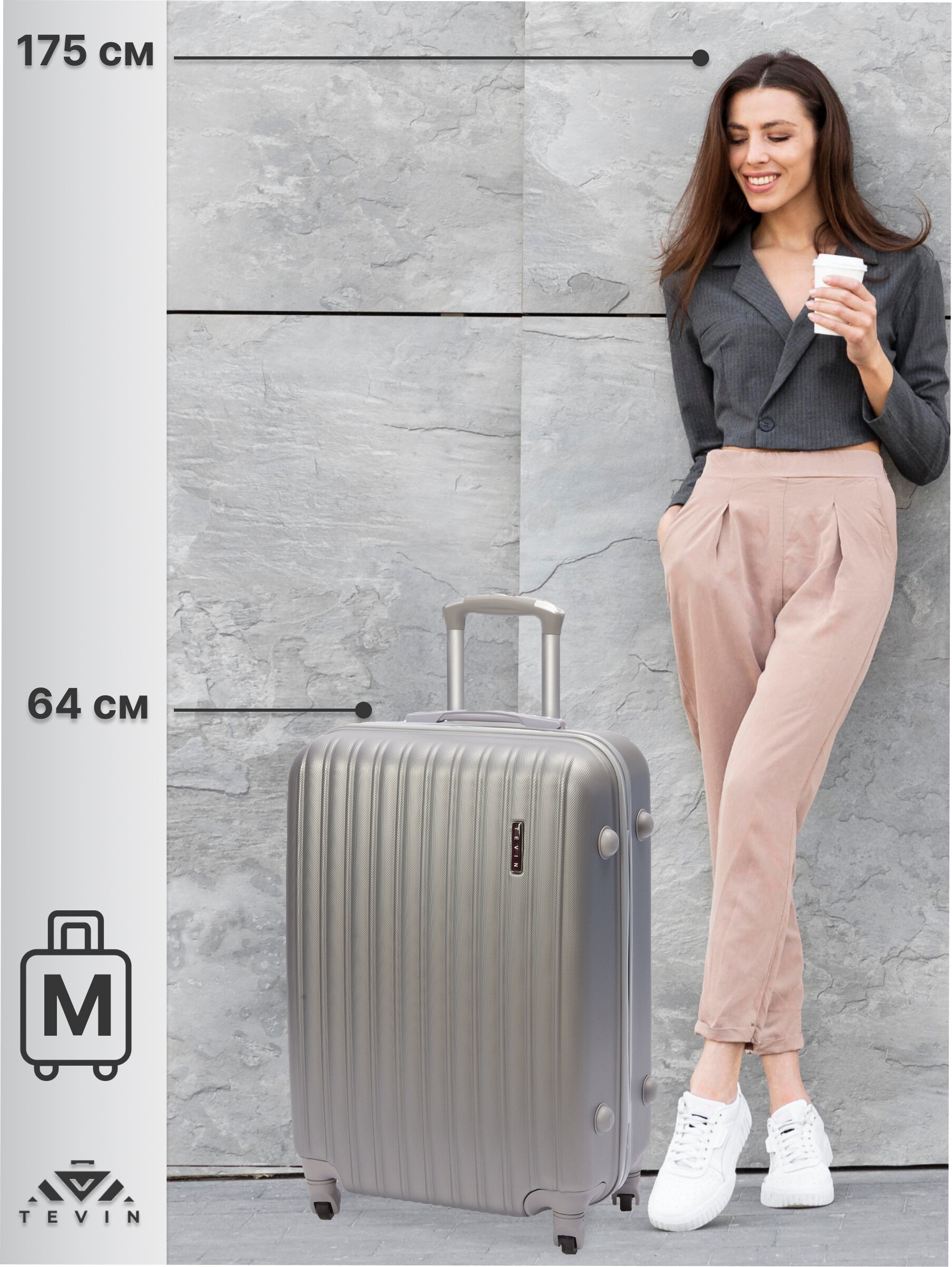 Купить Чемодан на колесах дорожный средний багаж для путешествий m TEVIN размер М 64 см 62 л легкий 3.2 кг прочный abs (абс) пластик Серое серебро