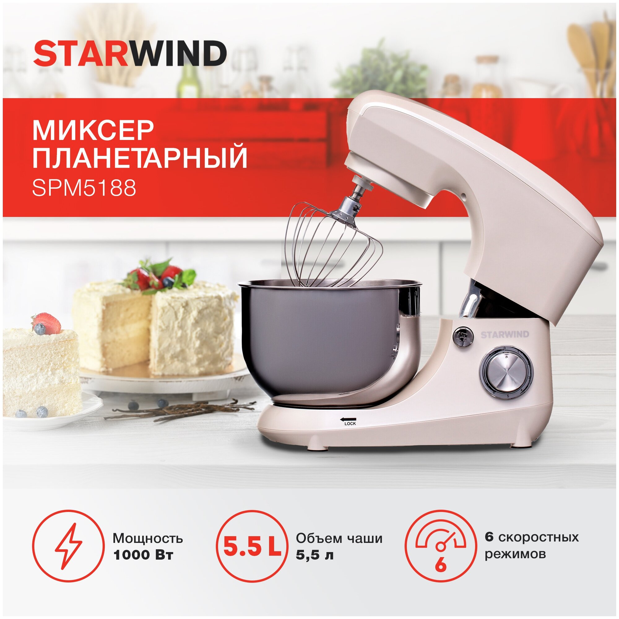 Планетарный миксер Starwind SPM5188, 6 скоростей, 1000 Вт
