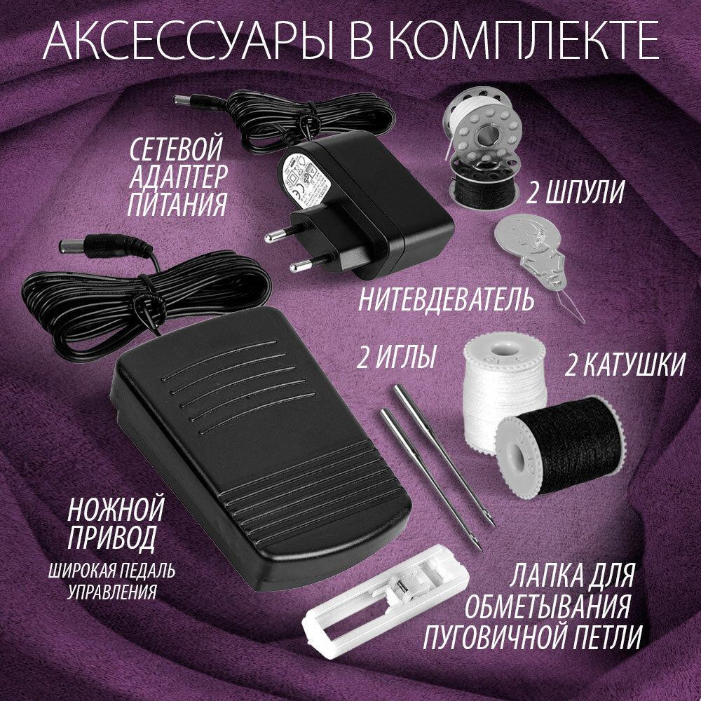 | Комплектация | швейная машина, шпуля большая - 2 шт., шпуля малая - 2 шт., нитевдеватель, игла, ножной привод, сетевой адаптер питания, руководство по эксплуатации, гарантийный талон |