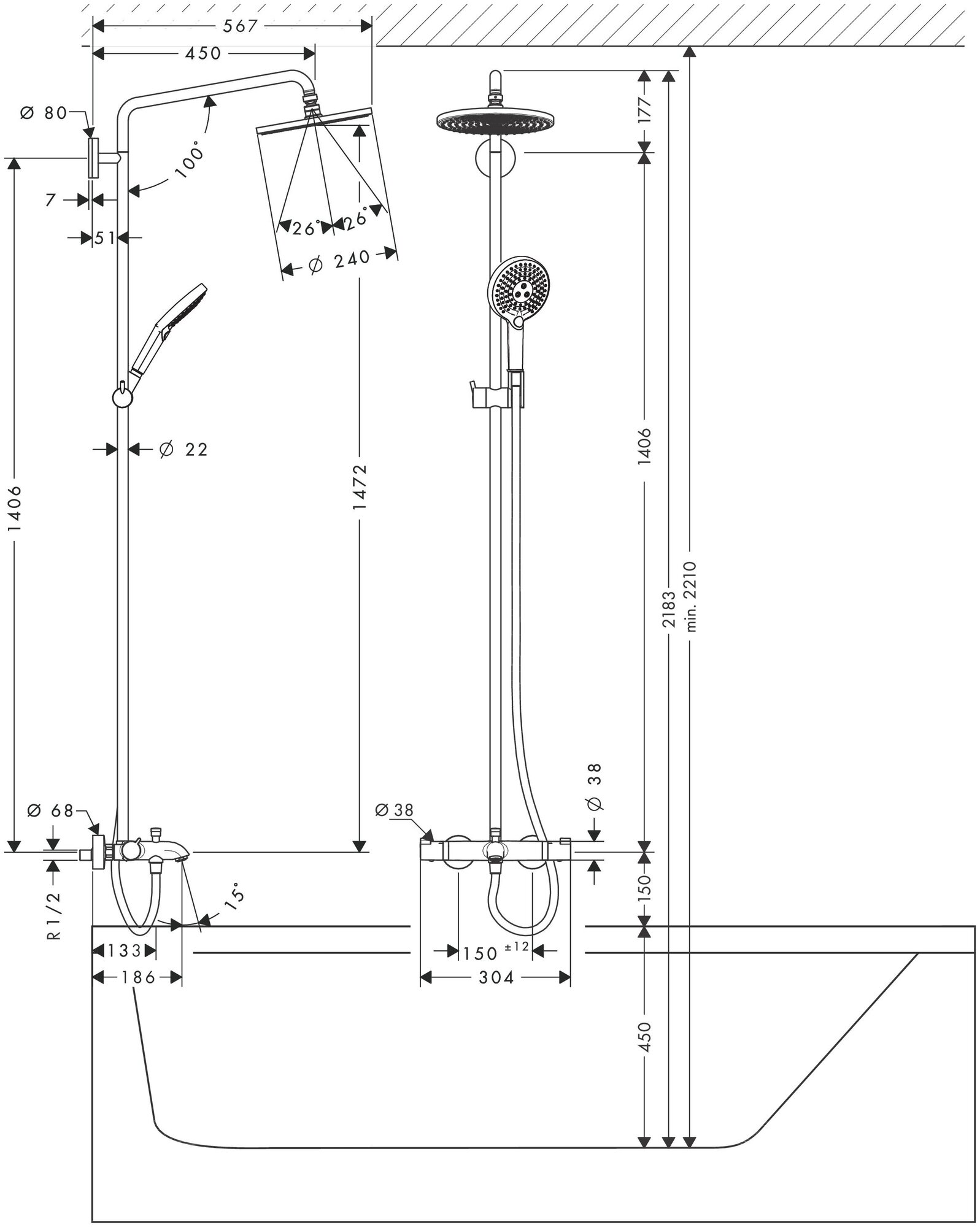 | Дополнительная информация | высота стойки для душа: 1584 мм; диаметр душевой лейки: 125 мм; диаметр верхнего душа: 240 мм |