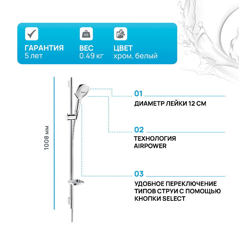 | Дополнительная информация | покрытие белый/хром; высота стойки для душа: 1008 мм; диаметр душевой лейки: 120 мм |