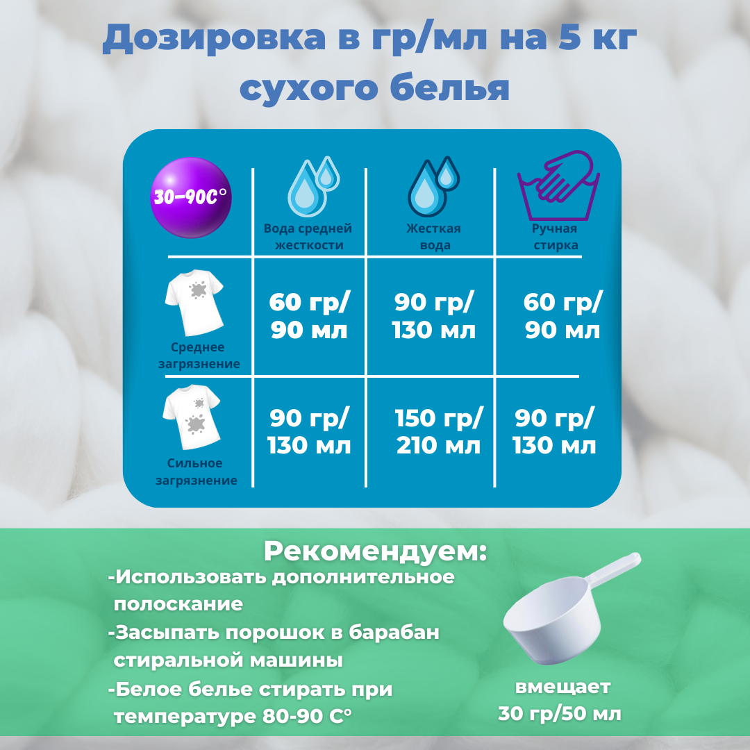 | Минусы: | 1,5кг хватает на месяц (2 взрослых и 5месячный ребенок)- быстрее заканчивается чем если гелем стирать(( |