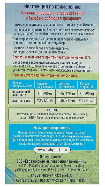 | Минусы: | 1,5кг хватает на месяц (2 взрослых и 5месячный ребенок)- быстрее заканчивается чем если гелем стирать(( |