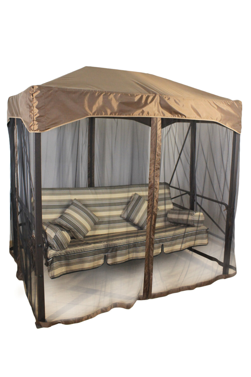 Купить Качели-шатер 4-х местные Мебельторг Монреаль Каркас коричневый/Коричневый,бежевый рис.полоска