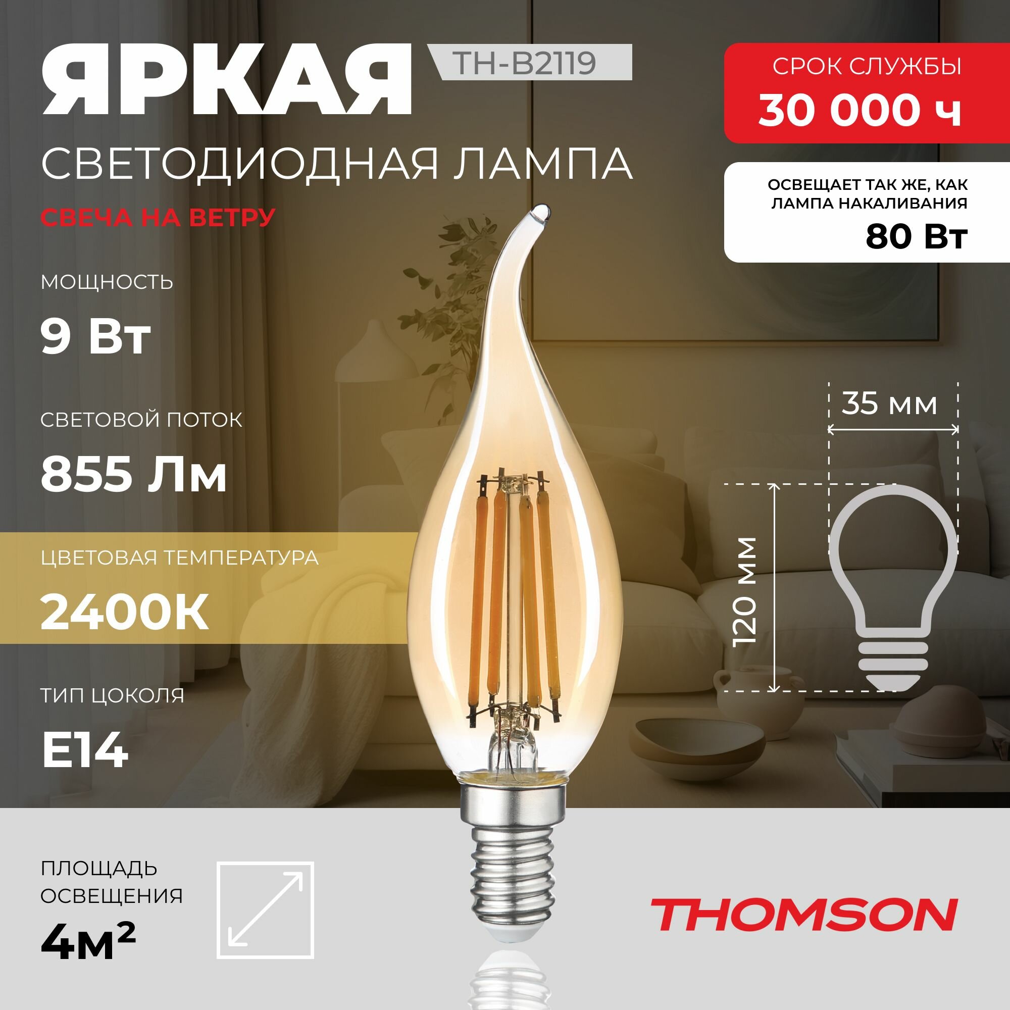Лампочка Thomson филаментная TH-B2080 11 Вт, E14, 4500K, свеча на ветру, нейтральный белый свет