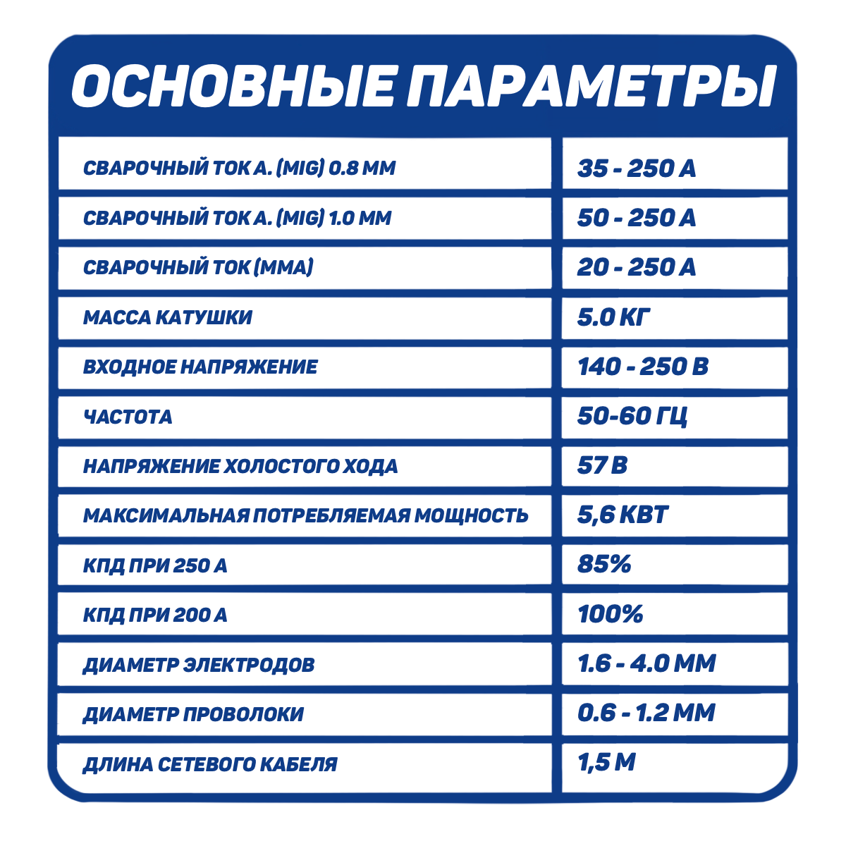 | Макс. сварочный ток при непрерывной работе | 250 А |