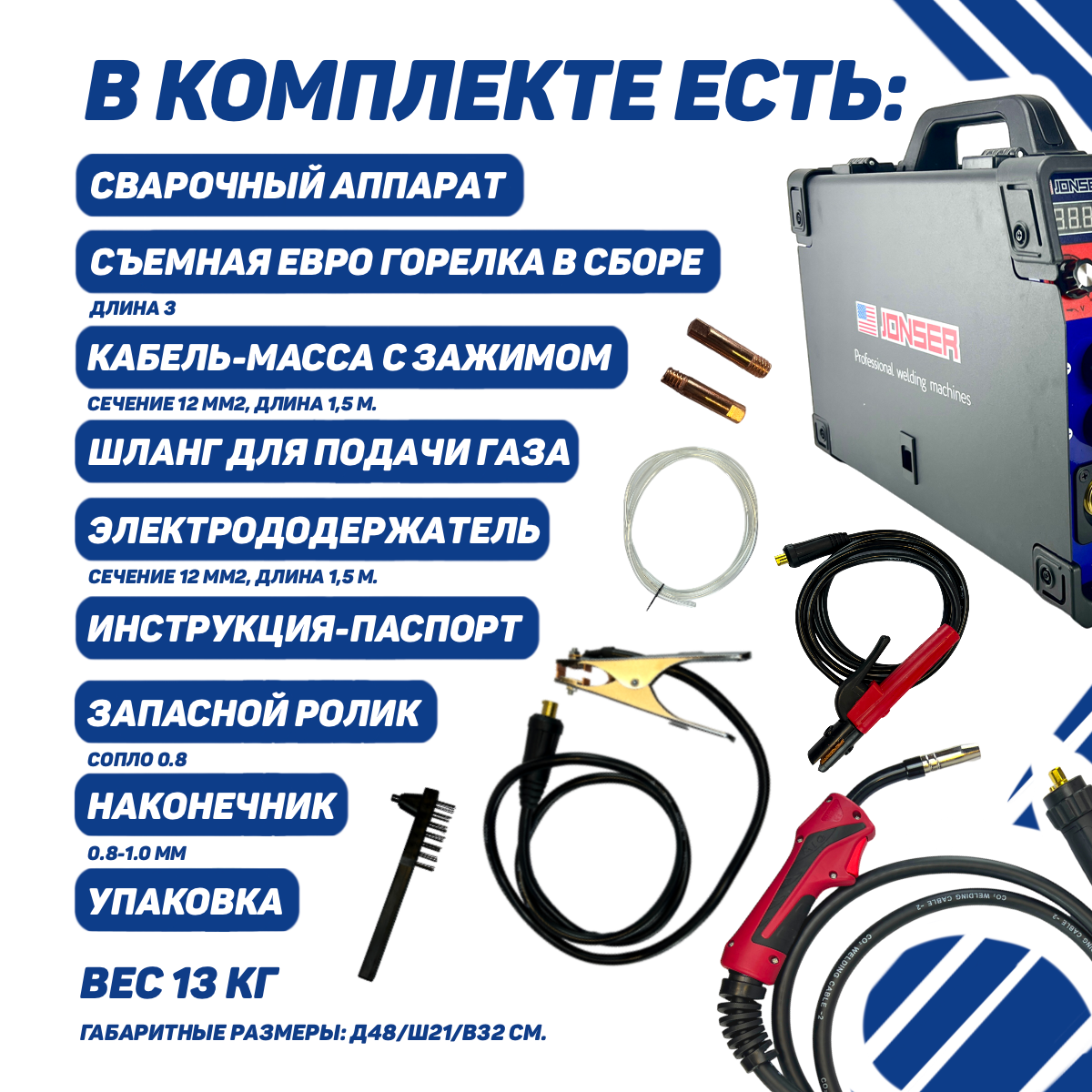 | Комплектация | Комплектация: - Сварочный аппарат - 1шт. - Горелка в сборе (MIG-15) длина 3 м. - 1шт. - Кабель-масса с зажимом и силовым разъемом СКР в сборе, длина 2 м. - 1шт. - Держатель с кабелем и силовым разъемом в сборе, длина 3 м. - 1шт. - Щетка-молоток - 1шт. - Руководство по эксплуатации |