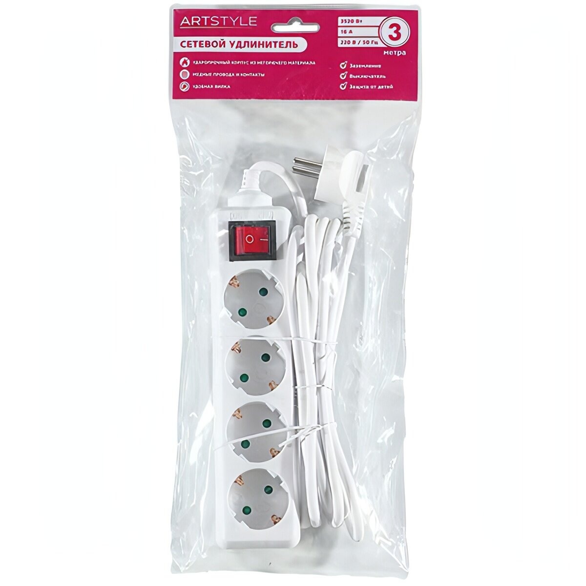 ARTSTYLE CL-C43GSW Сетевой удлинитель белый, 4 гнезда, длина провода 3м, 220В, 16А, с заземлением, с выключателем