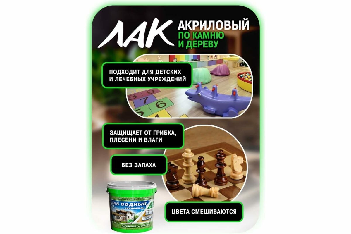 Лак Водный по Дереву и Камню White House 2.2кг Белый, Полуглянцевый для Внутренних и Наружных Работ.