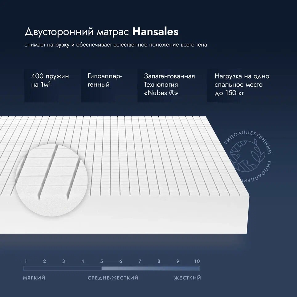 Матрас беспружинный, 180х200 см, Hansales Deluxe, двусторонний, ортопедический, средне-жесткий, анатомический матрац для двуспальной кровати