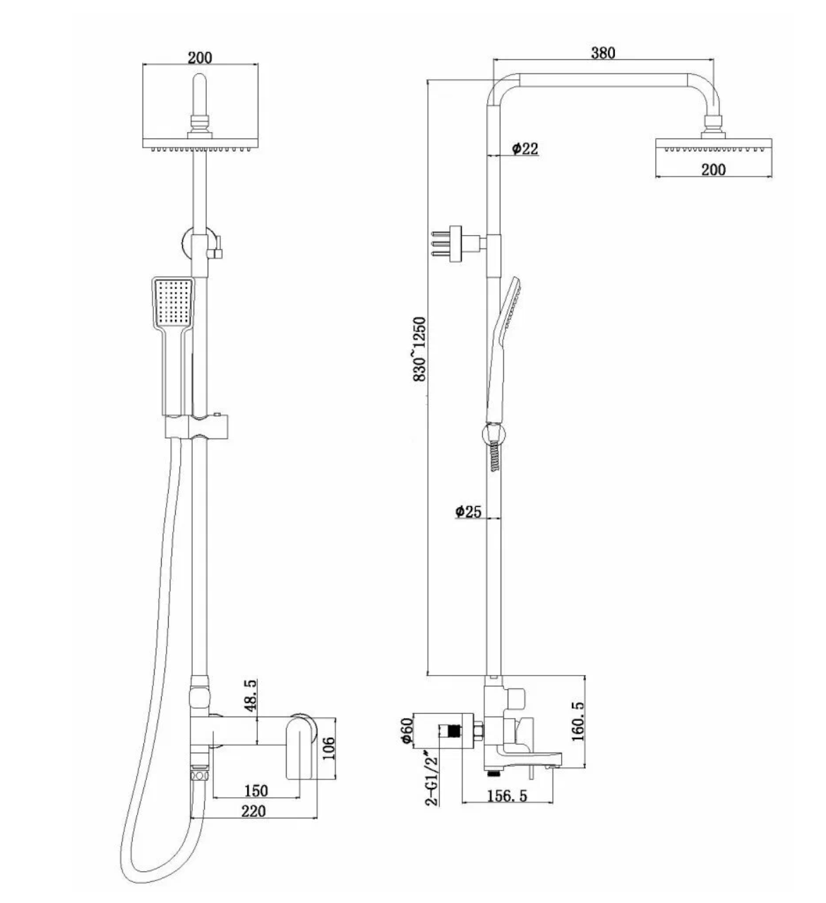 | Дополнительная информация | высота стойки для душа: 1250 мм; длина верхнего душа: 200 мм; ширина верхнего душа: 200 мм |