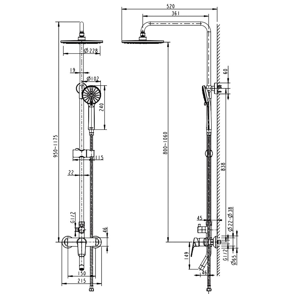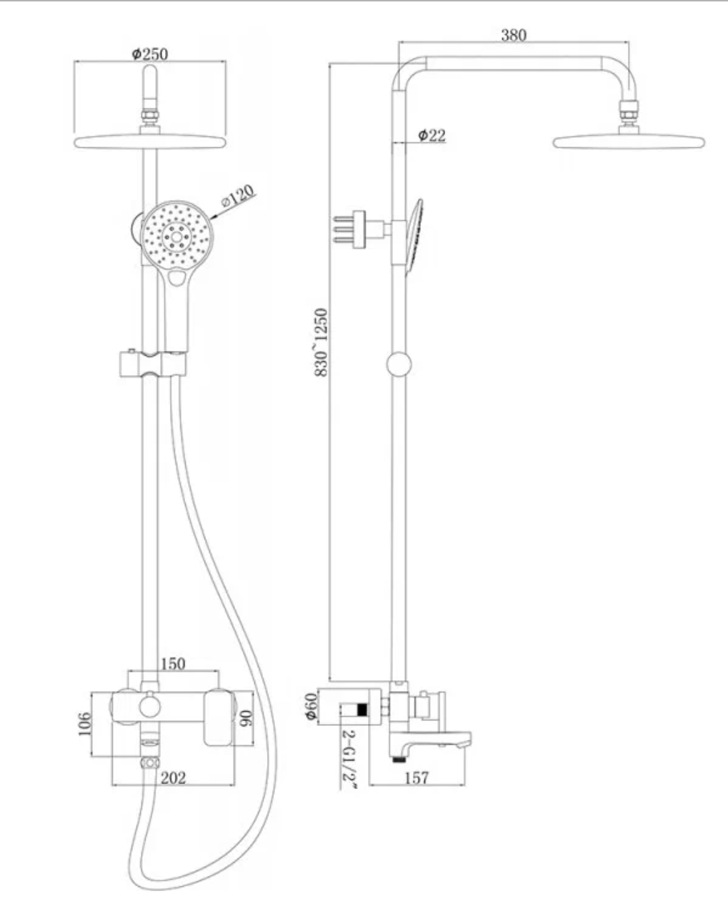 | Дополнительная информация | высота стойки для душа: 1250 мм; диаметр душевой лейки: 120 мм; диаметр верхнего душа: 230 мм |