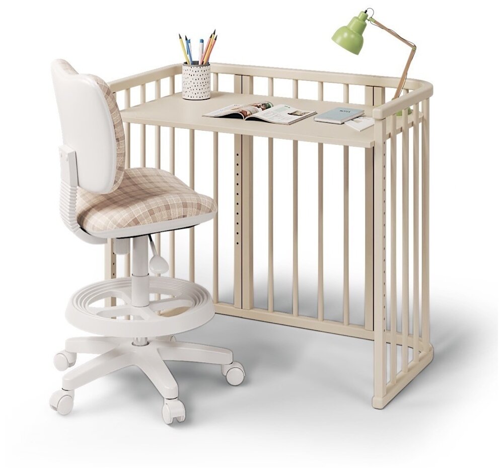 | Особенности | кроватка имеет 5 вариантов трансформации: люлька / приставная кроватка / письменный стол / стульчик для кормления и для занятий / диванчик; матрасик не входит в комплект |