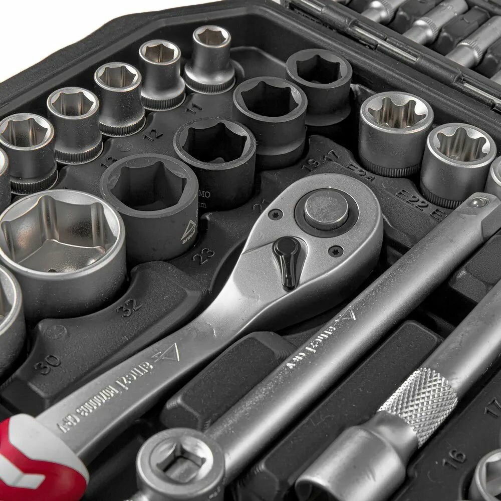 | Головки торцевые подробно | 1/4”: 4, 4.5, 5, 5.5, 6, 7, 8, 9, 10, 11, 12, 13, 14 мм; 1/4” с вставкой: H3, H4, H5, H6, T8, T10, T15, T20, T25, T30, SL4, SL5.5, SL7, PH1, PH2, PZ1, PZ2; трещотка 1/4”DR 72 зубца; вороток скользящий Т-образный 1/4”DR; удлинитель 1/4”DR: 50 мм, 100 мм; шарнир карданный 1/4”DR; удлинитель гибкий 1/4”DR: 150 мм; вороток с торцевой рукояткой 1/4”DR; переходник с 1/4”DR на 1/4”HDR; 1/2”: 14, 15, 16, 17, 18, 19, 21, 22, 24, 27, 30, 32 мм; трещотка 1/2”DR 72 зубца; шарнир карданный 1/2”DR; удлинитель 1/2”DR: 125 мм, 250 мм; свечные 1/2”: 16 мм, 21 мм |