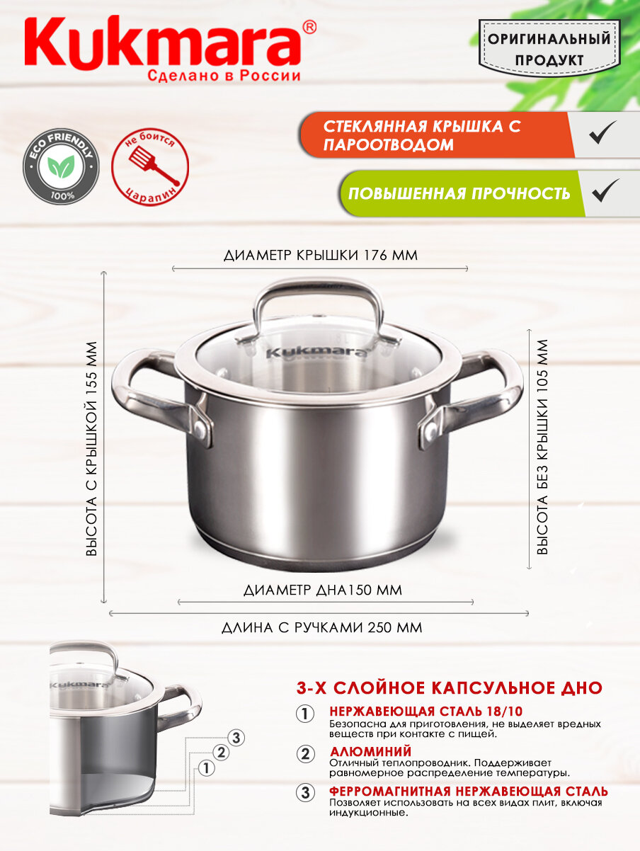 Купить Кастрюля из нержавеющей стали Kukmara линии "LEON" 1,8л, д.16см, со стекл. крышкой