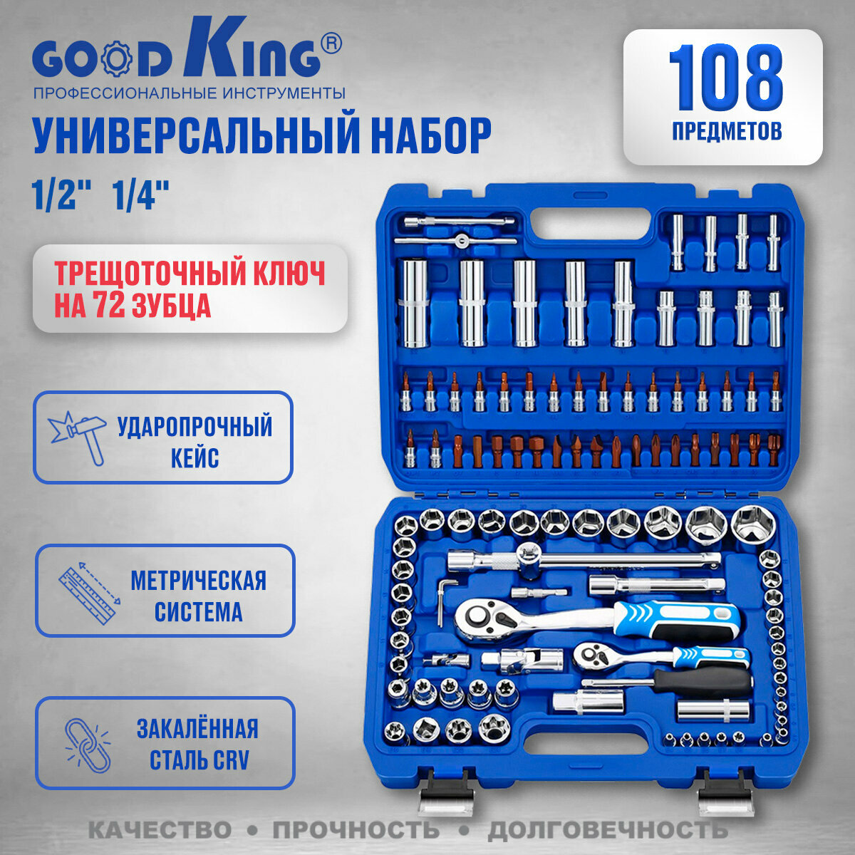 Набор инструментов для авто GOODKING 108 предметов, 1/4 1/2, трещотка 72 зуба B-10108