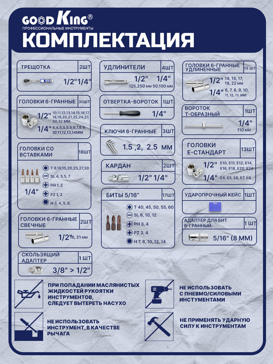 | Головки торцевые подробно | удлиненные 1/2": 14, 15, 17, 19, 22 мм; удлиненные 1/4": 6, 7, 8, 9, 10, 11, 12, 13 мм; удлиненные с наконечниками 1/4": PZ1, PZ2, H3, H4, H5, H6, SL4, SL5.5, SL6.5, T8, T10, T15, T20, T25, T27, T30, PH1, PH2; 1/2": 10, 11, 12, 13, 14, 15, 16, 17, 18, 19, 20, 21, 22, 24, 27, 30, 32 мм; 1/4": 4, 4.5, 5, 5.5, 6, 7, 8, 9, 10, 11, 12, 13, 14 мм; E-стандарт 1/2": E10, E11, E12, E14, E16, E18, E20, E24; E-стандарт 1/4": E4, E5, E6, E7, E8; свечные 1/2": 16, 21 мм |