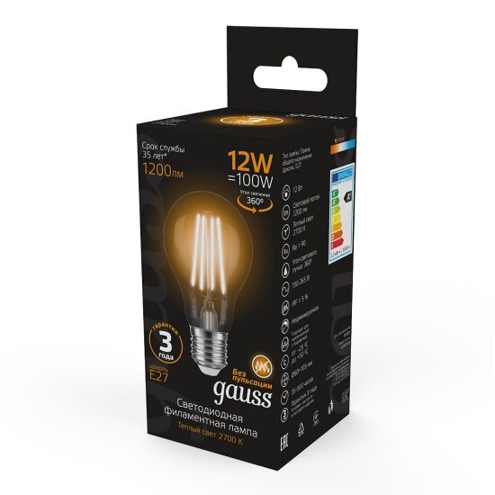 Купить Светодиодная лампа Gauss Filament А60 12W 1200lm 2700К Е27 LED 1/10/40