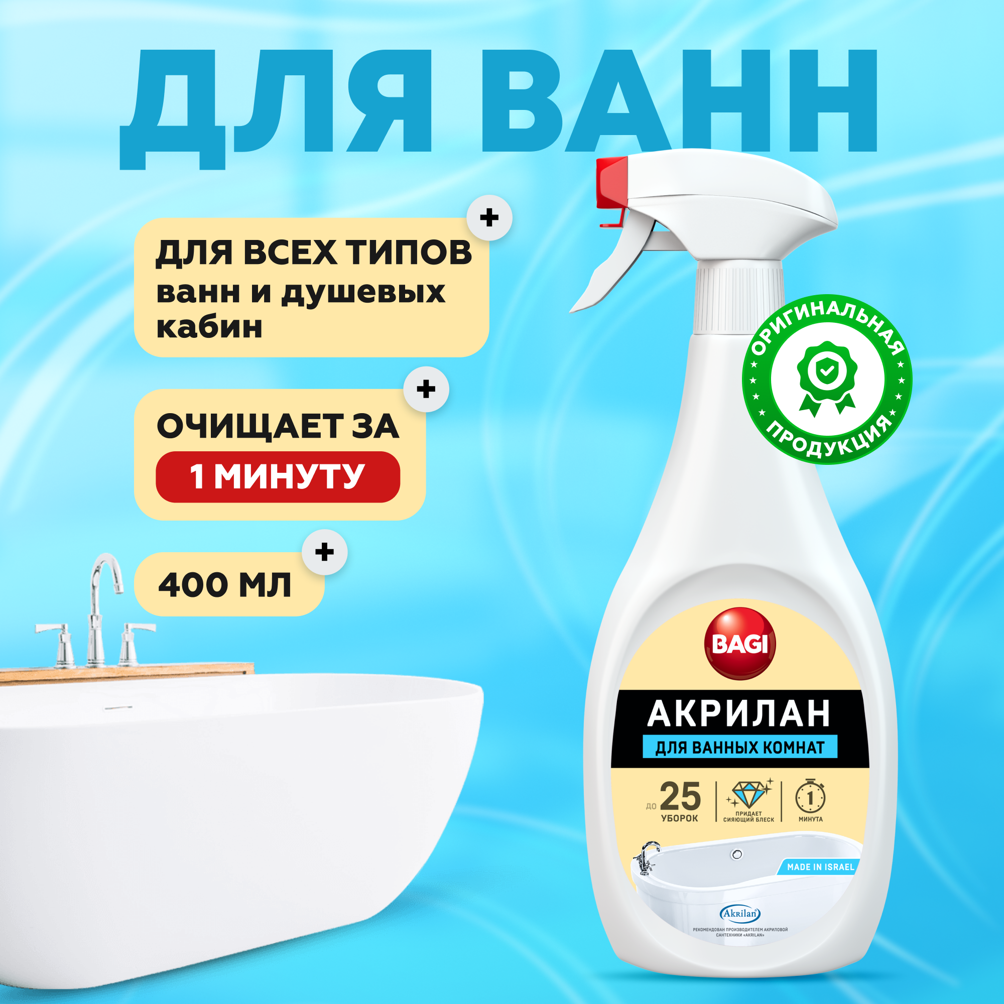 Баги Акрилан Особый спрей для чистки и обновления душевых кабин, акриловых ванн, джакузи, бассейнов 400 мл